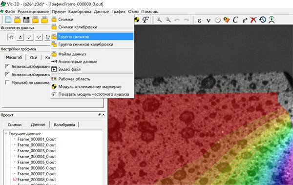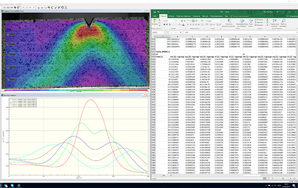 Экспорт и дальнейшая обработка полученных данных – необходимый процесс получения требуемых результатов испытания. Vic-3D поддерживает широкий спектр инструментов для пост-процессной обработки: большое количество встроенных вычислений, настройка пользовательских вычислений, экспорт данных в сторонние приложения, а также совместимость файлов проекта со скриптами Phython.