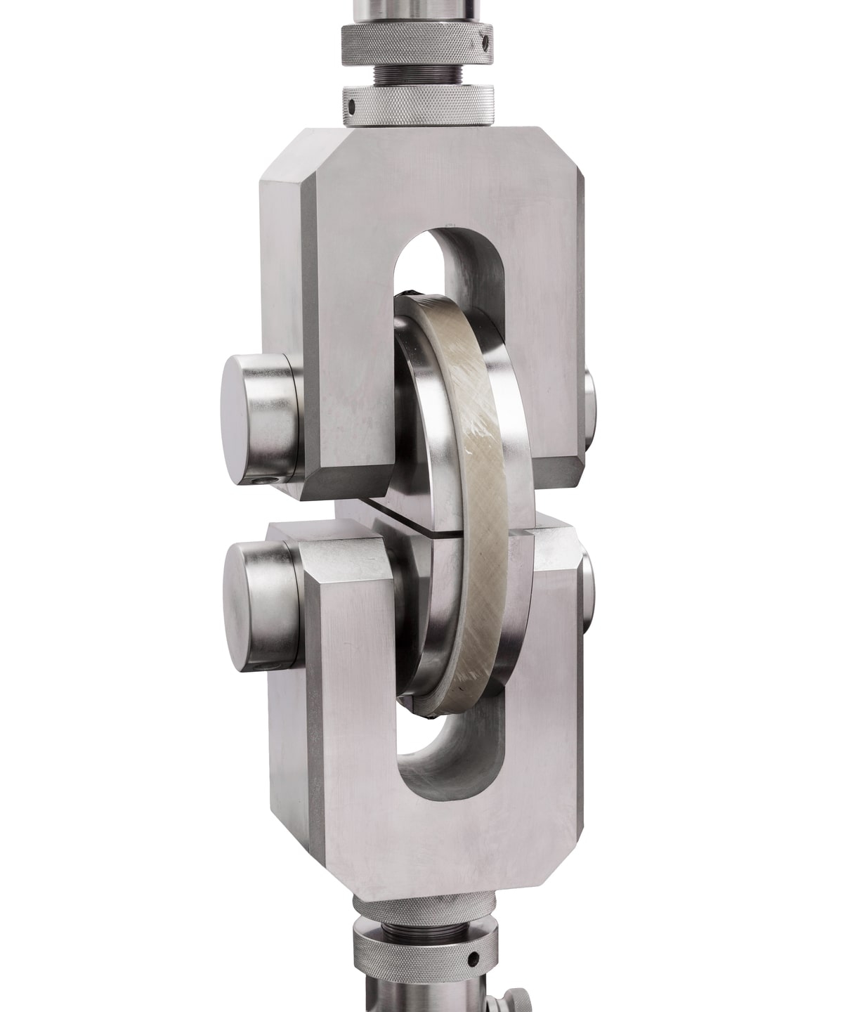 Модель используется для испытаний кольцевых образцов на растяжение, подходит для труб диаметром до 300 мм. Имеет два полудиска с концентрическими пазами разного диаметра — для труб различных размеров.